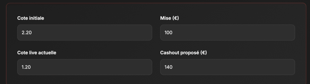 Notre nouvel outil, le Calculateur de Marge Cashout, est conçu pour rétablir la transparence et vous donner le pouvoir de décision. En entrant seulement trois données (la mise, la cote initiale, et la cote live actuelle), vous découvrez instantanément :