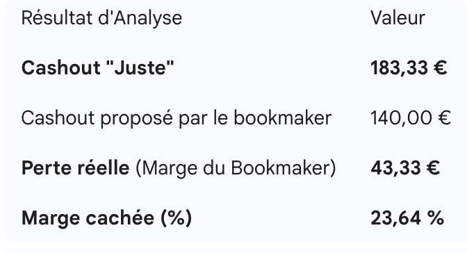 Lorsque vous décidez d’utiliser le Cashout, le bookmaker vous propose un montant. Ce que vous ne voyez pas, c’est la différence entre ce montant et le « Cashout Juste » — c’est-à-dire le montant que vous devriez mathématiquement recevoir en fonction de la cote en direct. C’est dans cette différence que se cache la perte réelle que vous subissez.