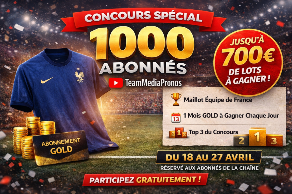 La chaîne YouTube TeamMediaPronos vient de franchir un cap symbolique : 1000 abonnés. Pour marquer le coup et remercier tous ceux qui nous suivent depuis le début, on a décidé de lancer un concours spécial 1000 abonnés avec de nombreux cadeaux à gagner.