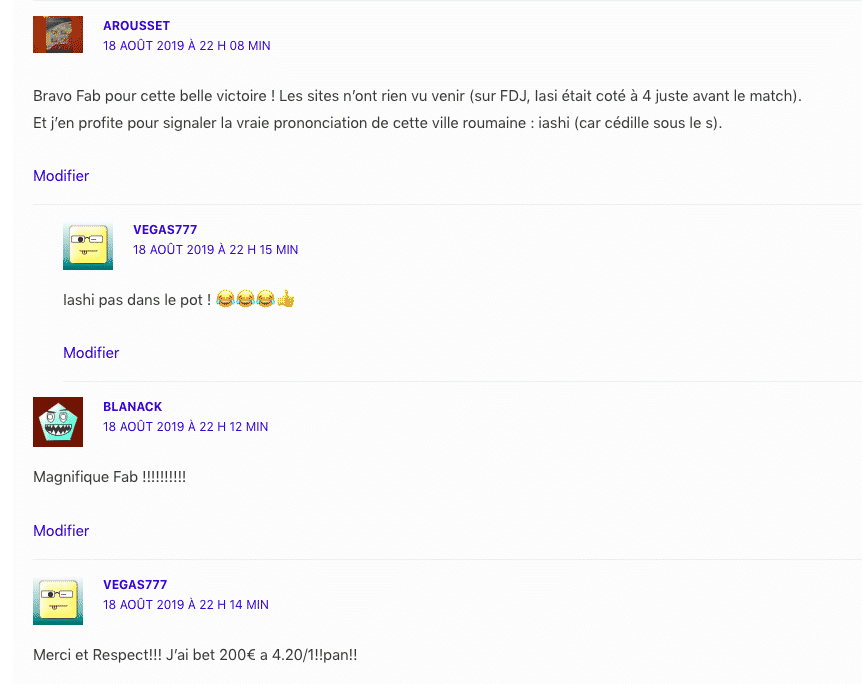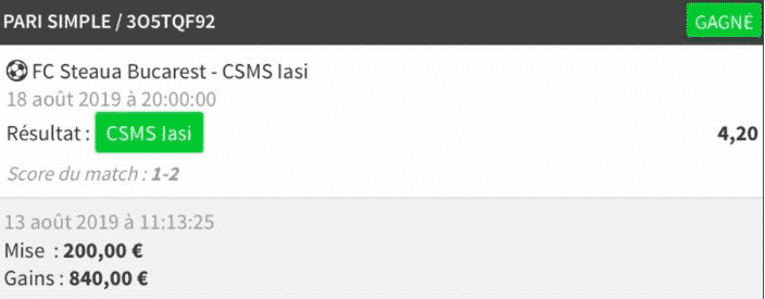 Un grand bravo à Fab qui a passé une superbe value sur son pronostic réservé aux membres VIP : Iasi @5.00 ✅ en Roumanie. Je fais petit joueur à côté avec le Legia @2.58 ✅ (Europa League) 🙂