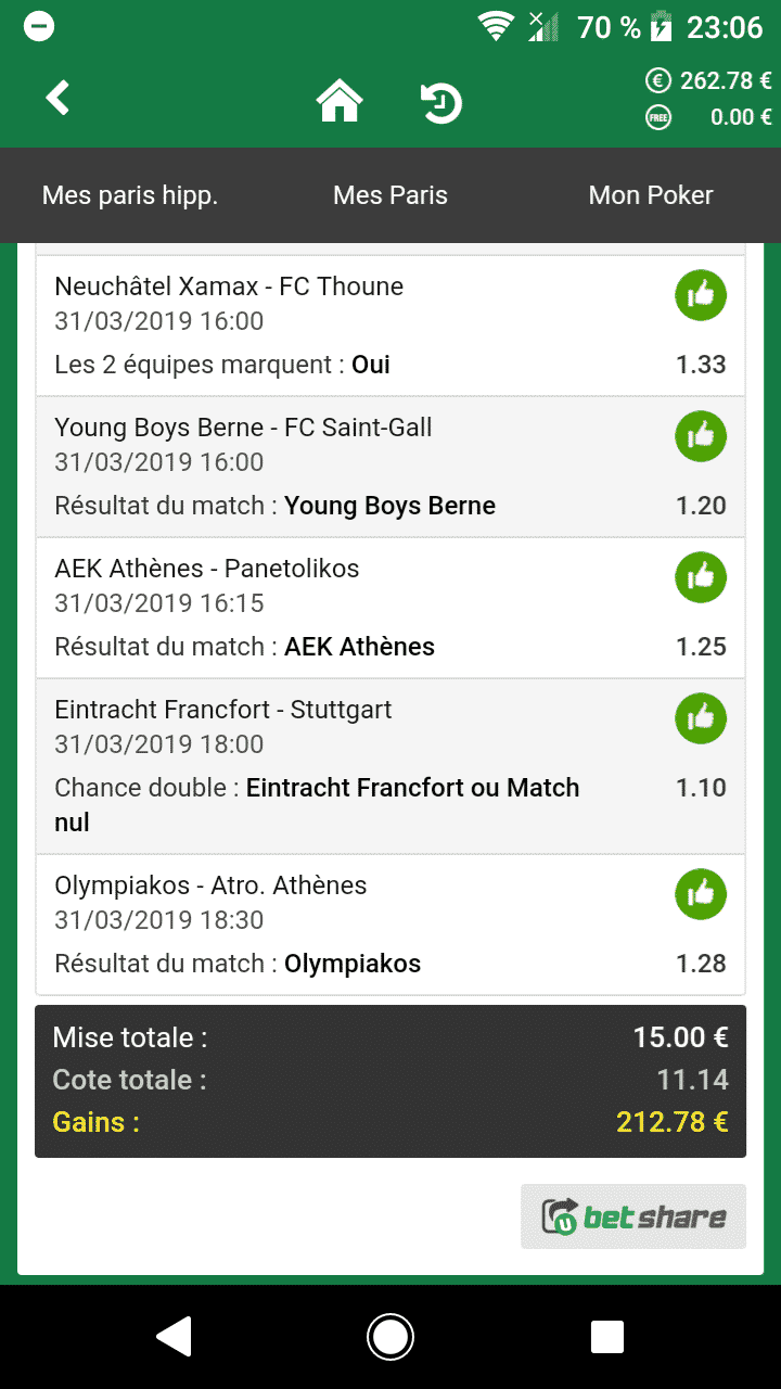 Merci Lionel pour mon ticket 😉 (j’ai regardé tout les résultats hier soir.. C’était chaud pour certains ! Notamment l’Olympiakos le dernier match !)