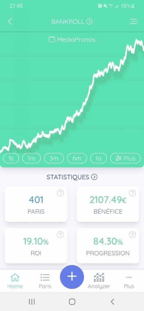 Ce ne sont que les pronos des tipsters, si tu les suis tous ou quasiment tous et que tu respecte une mise fixe (1% de ma BK pour moi) tu auras à peu près ce résultat ! 1% par pari principal, ça peut monter un peu plus lorsqu’il y a des funs ou autres paris en complément, et j’augmente cette mise fixe tout les 500€ de benef atteint toujours avec 1% de ma BK 😉