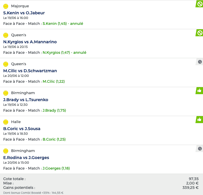 Pour la petite histoire, je ne tente jamais de fun mais j’avais vidé mon compte Parionsport avant le match de l’Australie pour prendre des paris à différentes sauces sur ce match et il restait 2 euros sur le compte. Je me suis dis « Tente un fun » pour prendre 800 euros, ça paiera les vacances. J’ai donc pris comme je le préssentais le but de la Jamaïque en seconde mi-temps, j’en avais parlé quelques jours auparavant sur le chat, qu’un relâchement possible en seconde. Je voyais aussi l’Australie marquer bien évidemment. La cote des deux marquent @7.00, puis j’ai combiné mes idées en ATP/WTA en limitant les risques. Les paris sont tout simplement ce que je vous ai proposé hier dans mon post sur l’ODG. Dommage que Kenin diminue la cote/le boost à cause de l’abandon de Jabeur! Il reste deux matchs comme dans ma liste hier : Cilic à midi et Goerges à 15h. On va donc pousser pour un petit gain !