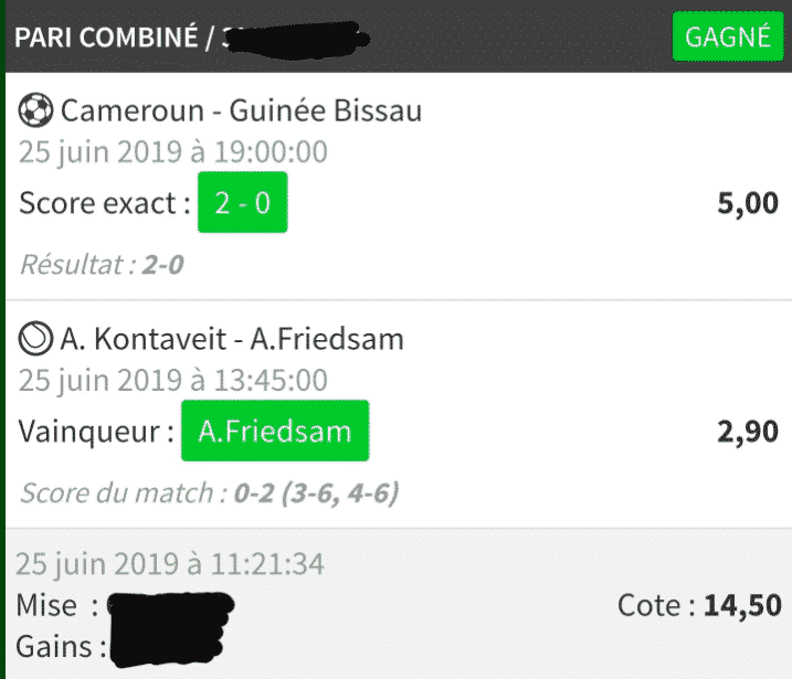 Mon pari sur le Cameroun passe avec un score exact 2/0. J’ai reçu un ticket sympa de Vrvn. Bravo à lui pour son pronostic Friedsam et merci pour la confiance ! Super cote @14.5 !