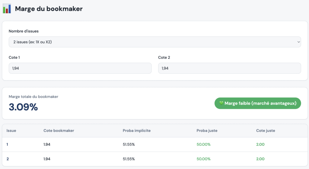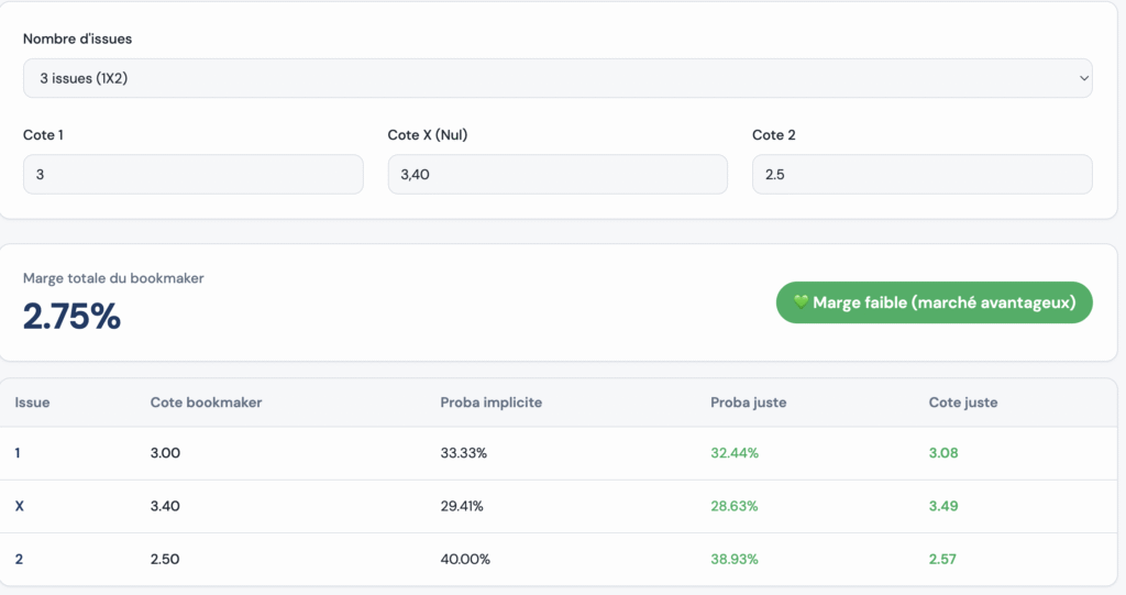 C’est la fonctionnalité la plus puissante de notre outil. En plus de la marge, la calculatrice vous donne la « Cote Juste » (Fair odds).