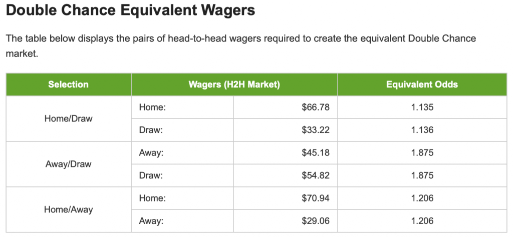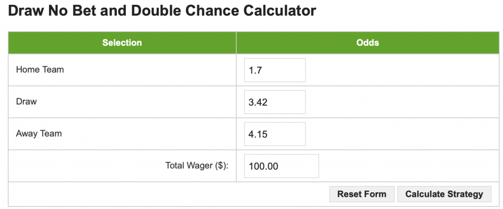 Cliquez sur Calculate Strategy et descendez un peu plus bas dans la page. En dessous du DRAW NO BET (REMBOURSÉ SI NUL), vous retrouvez les doubles chances. HOME/DRAW = le 1X (victoire domicile ou nul). AWAY DRAW = le X2 (le pari que j’ai choisi, victoire extérieur ou nul). HOME AWAY = le 1 ou 2 (victoire domicile ou extérieur).