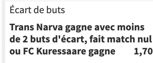 ** Voici le pari exact sur Winamax, ça correspond au handicap +1,5 de kuressaare. N’hésite pas à me dire si la cote est meilleure sur un autre bookmaker arjel, je poste rapidement car match à midi.