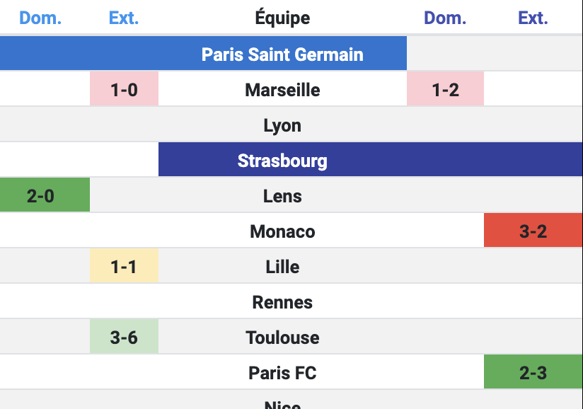 - Buts marqués/encaissés (Ligue 1) : PSG 13-5 (+8) / Strasbourg 14-7 (+7). Paris affiche la meilleure défense du championnat (seulement 5 buts encaissés en 7 matchs), Strasbourg a la deuxième meilleure attaque (14 buts en 7 matchs).