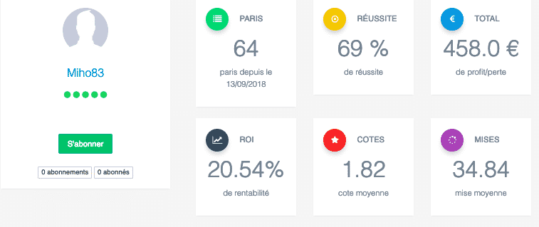 Perso je te suis depuis 16 paris avec des mises fixes à 20€ il y a eu seulement 3 échecs ce qui porte mon bilan à +8.25 unités (soit 166 euros de gains)